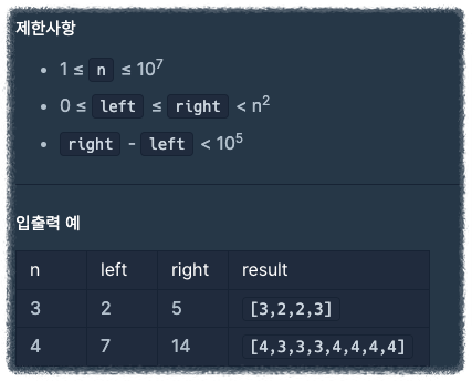 정수 n, left, right가 주어집니다. 다음 과정을 거쳐서 1차원 배열을 만들고자 합니다.