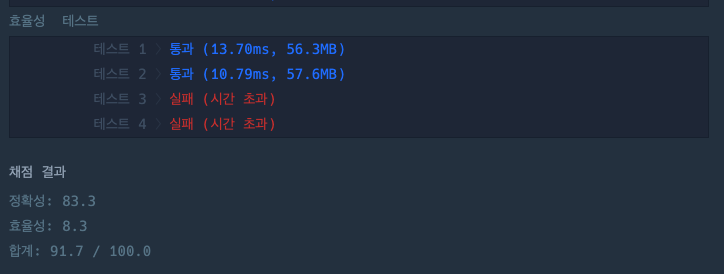 정확성 테스트는 통과하였지만 효율성 테스트에서 실패해서 어떻게 효율성을 개선할까 고민하다가