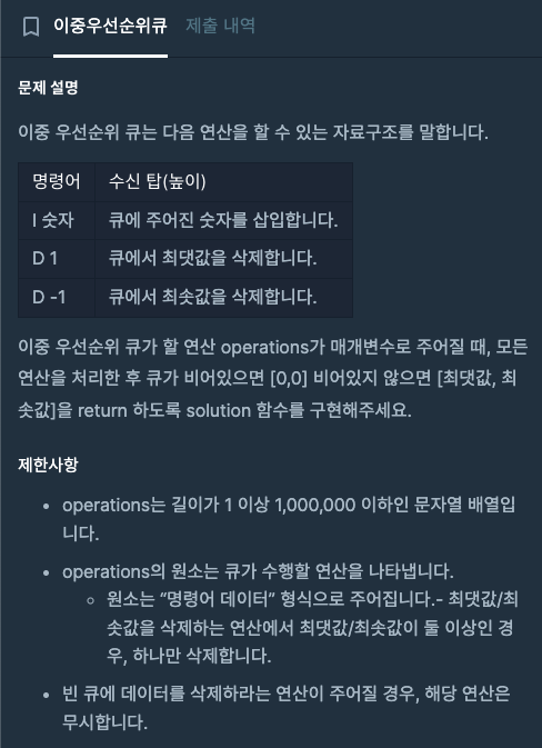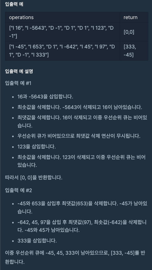 만약 큐의 사이즈가 1일 때 내 코드는 항상 [0, 최솟값]을 리턴할 것이다 하지만 이 경우에는 최댓값과 최솟값이 같은 값으로 리턴되어야 했다는 것을 깨닫고 코드를 보완하였다.
