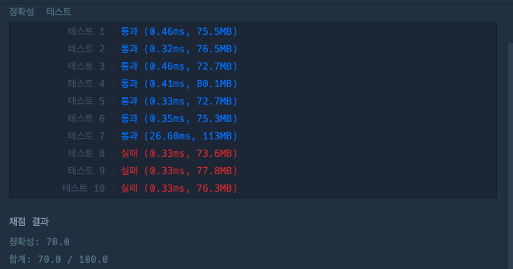 위와 같이 코드를 작성하여 제출하였지만 테스트 케이스 3개에서 통과되지 못하고 실패하였다.