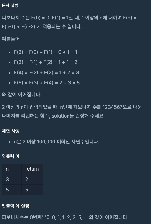 간단하게 반복문을 n번 돌면서 배열에 피보나치 수를 저장하고 배열의 n번째 값에 1234567를 나눈 나머지 값을 반환하는 방법으로 접근했다.
