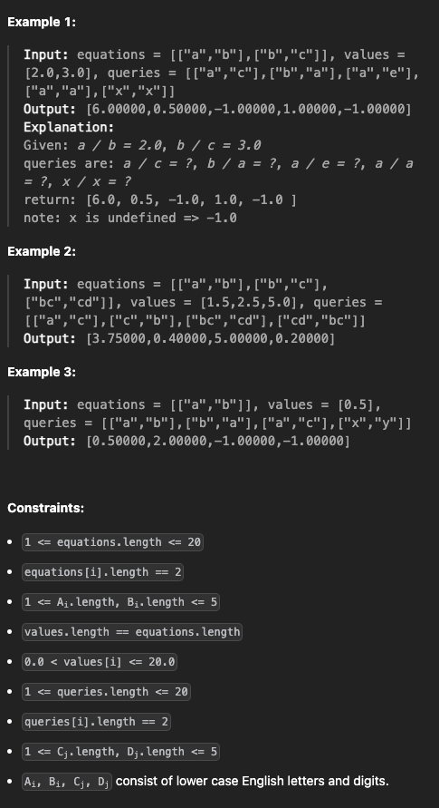public double[] calcEquation(List<List<String>> equations, double[] values, List<List<String>> queries) {
