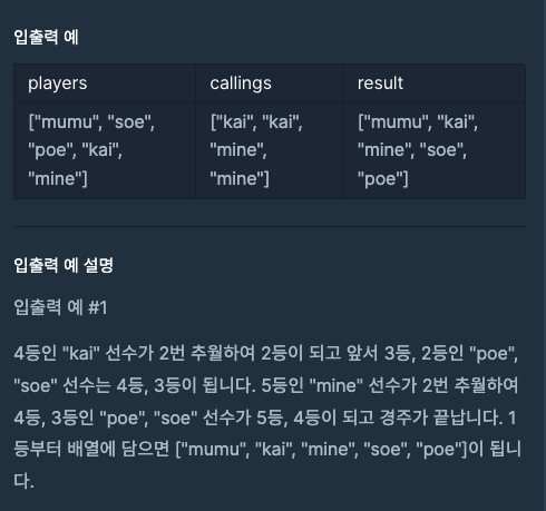 callings 를 순회하면서 players 배열에 바로 접근하여 순위를 변경해주었고 그에 따라 따로 선언했던 HashMap 또한 갱신해주어서 문제를 해결 하였다.