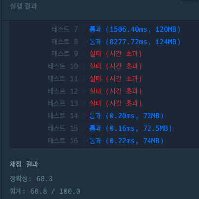 이렇게 코드를 작성하였는데 결과는 5개의 케이스에서 시간초과가 발생하였다.