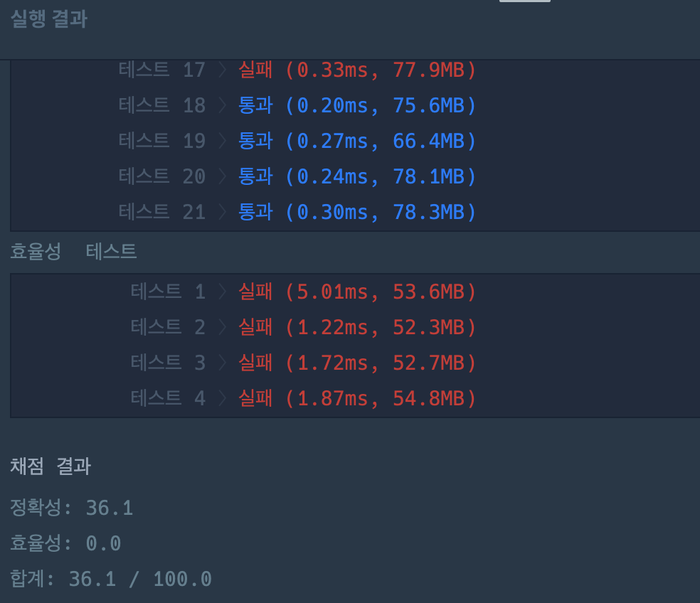 위와 같이 코드를 수정하였지만 아쉽게도 효율성 테스트에서는 여전히 모두 실패하였다.