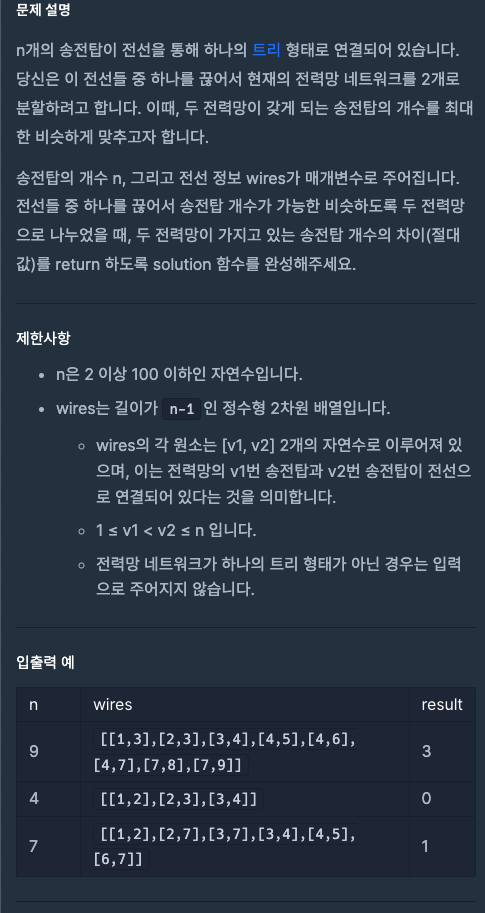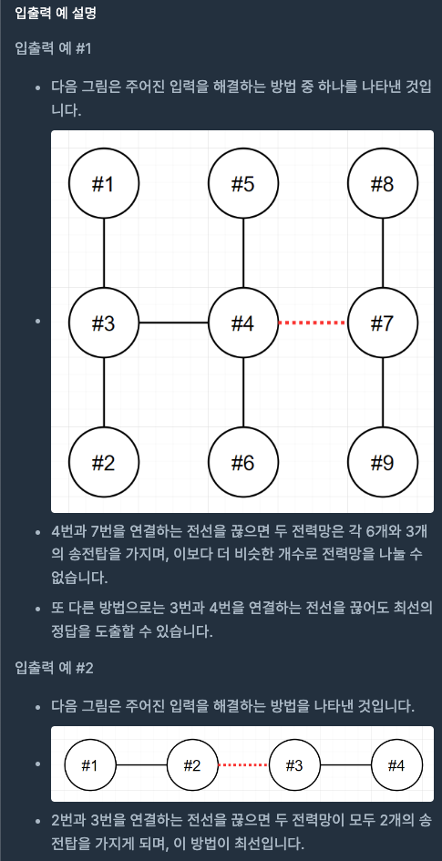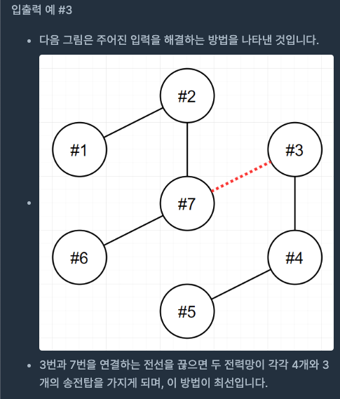 2. [1]의 반복문 안에서 끊어진 wire에 붙어있던 첫번째 송전탑을 기준삼아 송전탑에 연결되어 있는 송전탑의 개수를 dfs를 이용하여 구한다.